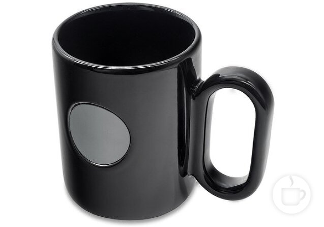Stilingas keraminis puodelis su blizgiu paviršiumi, suteikiančiu jam modernų ir elegantišką vaizdą. Priekyje yra apvalus grafito spalvos metalinis elementas, puikiai tinkantis graviravimui. Ergonomiška rankena užtikrina patogų naudojimą.