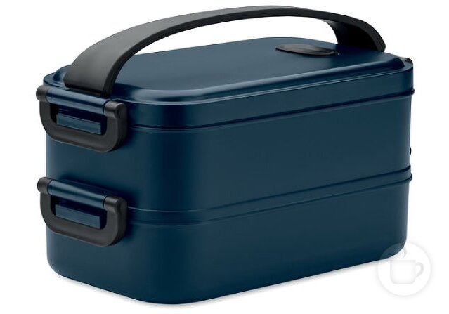 PP plastiko dviejų aukštų pietų dėžutė su nuimama pertvara, šoninėmis sagtimis ir sandariu dangteliu. Turi patogią nešimui rankeną.