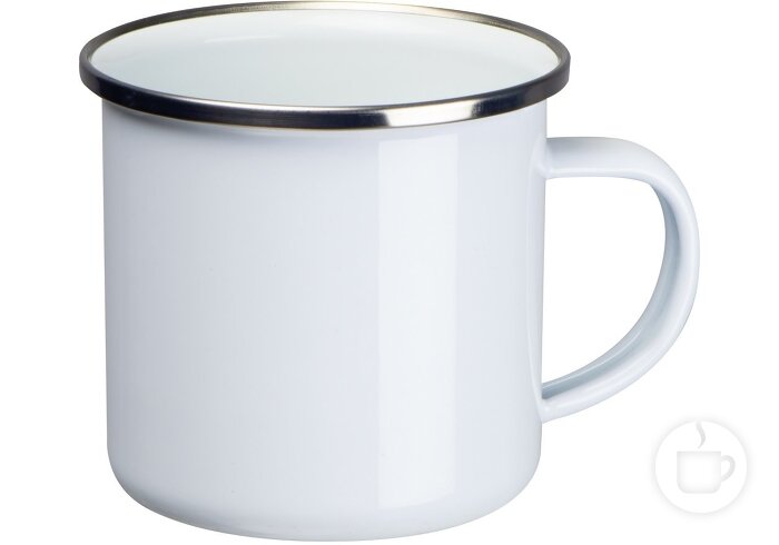 Vintažinio stiliaus metalinis, emaliuotas puodelis su sidabro spalvos apvadu, pritaikytas sublimacinei spaudai